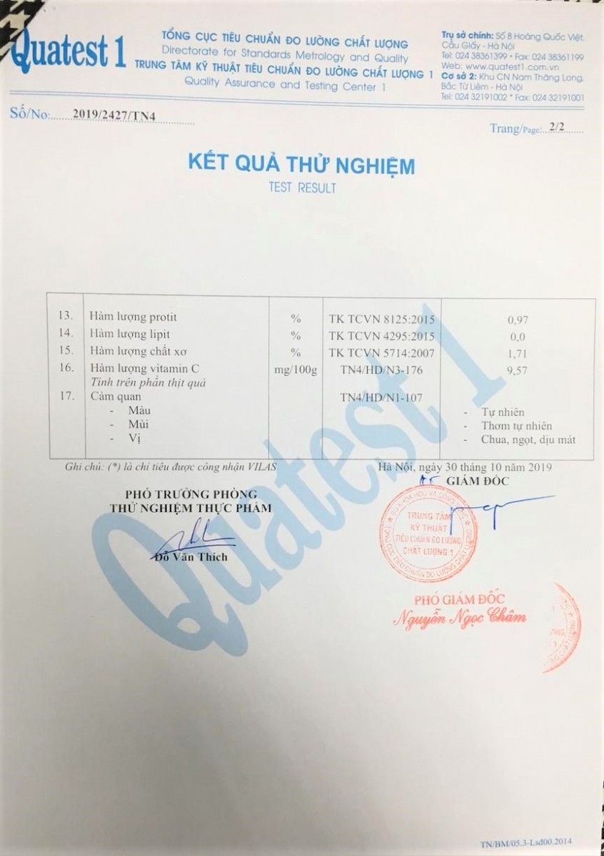KẾT QUẢ PHÂN TÍCH CHẤT LƯỢNG SẢN PHẨM CAM GIÒN XUÂN HÒA THƯỢNG LỘC